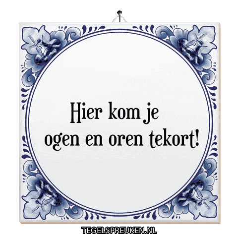 a blue and white tile with the words hier kom je ogen en oren tekort