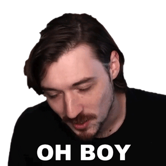 Aaron Brown, wearing a black shirt, looks down with a concerned expression as the text 'OH BOY' appears. A relatable reaction.