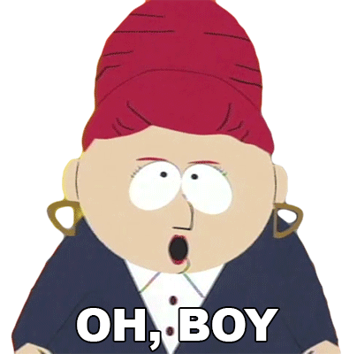 Sheila Broflovski from South Park reacts with a surprised expression, mouth agape, as the caption 'OH, BOY' appears.