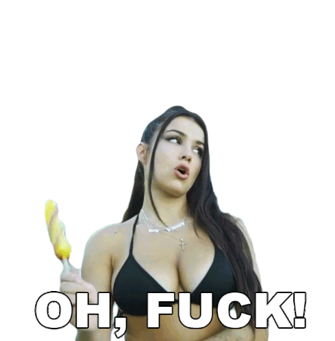 Shainny, wearing a black bikini, holds a lollipop and exclaims 'OH, FUCK!' in this expressive animated sticker.