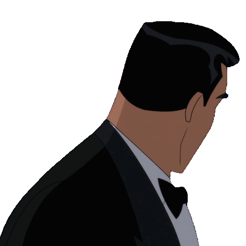 Bruce Wayne from Batman: Caped Crusader gives an awkward, polite smile while dressed in his classic tuxedo.
