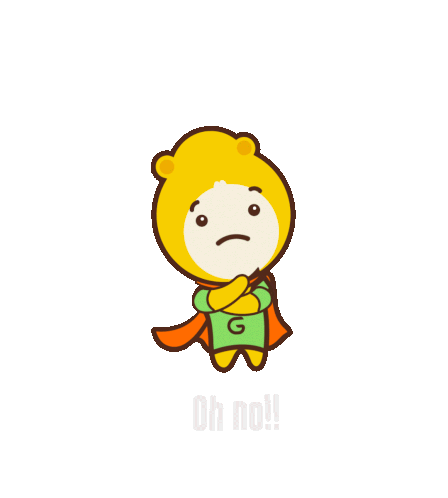 Gumazing, the cute cartoon character in a cape, expresses dismay with a sad face and the caption 'Oh no!!'