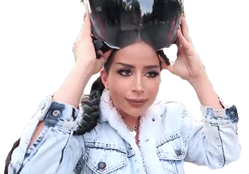 Amber Scholl struggles to put on a black motorcycle helmet, showing an awkward and confused expression as it seems to not fit.