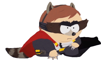 Eric Cartman as The Coon from South Park flinches with a worried expression, reacting to something bad.