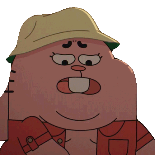 Richard Watterson, the pink rabbit, looks sad and disappointed in his hat and red jacket.