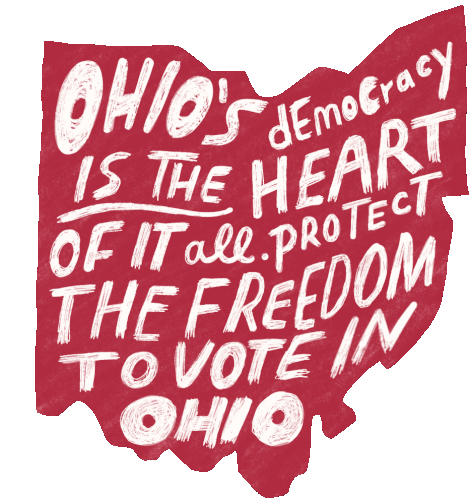 A powerful message on an Ohio map outline: 'Ohio's Democracy is the heart of it all. Protect the freedom to vote in Ohio.'