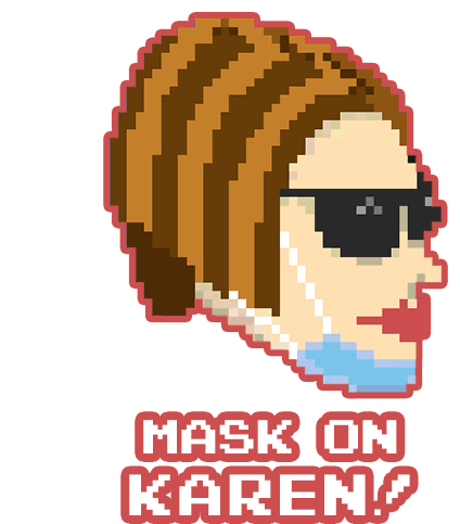 Pixel art illustration of a 'Karen' with sunglasses and mask, featuring the text 'MASK ON KAREN!'.