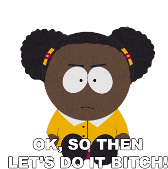 A determined South Park girl with pigtails says, 'Ok, so then let's do it bitch!' with an angry expression.