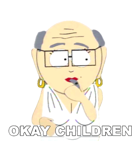 Herbert Garrison from South Park, holding a microphone, says 'Okay Children' with a stern expression.