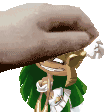 Olympia from Rayman Legends, a cheerful cartoon character, swings a wooden log over her head in a striking motion. She has green hair and a blue hat.