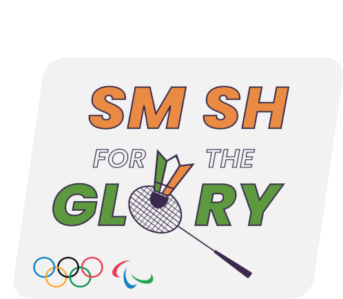 An animated sticker featuring 'Smash for the Glory' text, a badminton shuttlecock with Indian flag colors, and Olympic rings.
