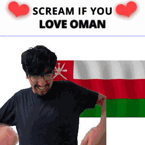 a man with glasses is screaming in front of a oman flag