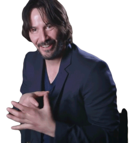 Keanu Reeves smiles enthusiastically, gesturing with his hands, conveying a positive 'On It' or 'Working On It' attitude.