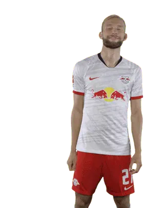 Footballer Joséángel Esmorís Tasende (Angeliño) in an RB Leipzig jersey, looking at his phone then putting it to his ear.