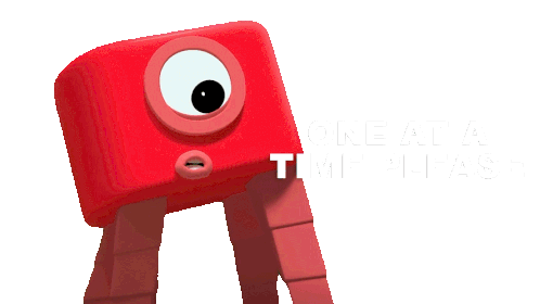 Numberblocks One, the red block character, says 'One At A Time Please' while teaching the one times table.