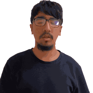 a man with glasses and a beard is pointing his finger at the camera