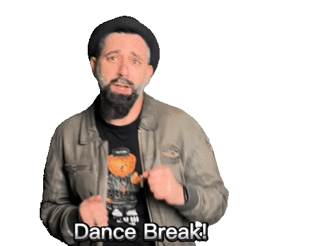 a man with a beard is wearing a teddy bear shirt and says dance break