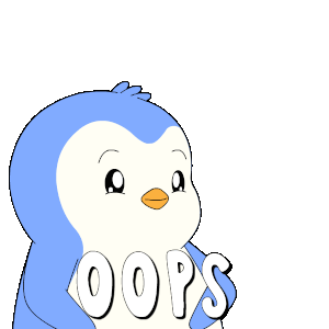 A cute blue and white cartoon penguin looks surprised and says 'Oops' as the word appears in front of it.