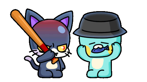 Ooz and Mates character, a dark cat, angrily swings a baseball bat at a scared blue otter-like creature wearing a hat.