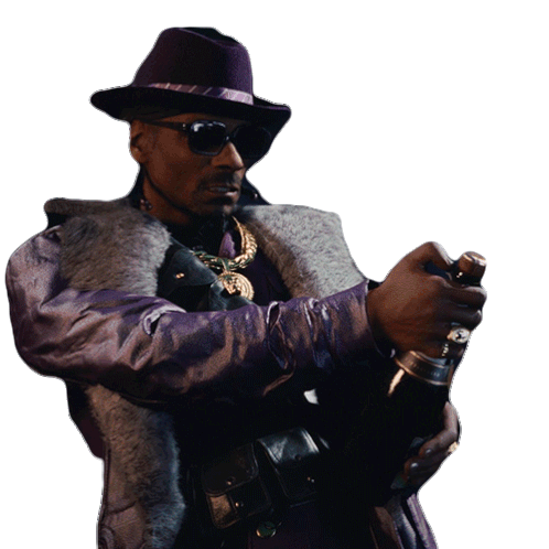 Snoop Dogg, dressed in a hat, sunglasses, and a fur-lined coat, pops open a bottle of champagne with a celebratory spray.