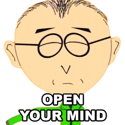 Mr. Mackey from South Park encourages viewers to 'OPEN YOUR MIND' with his signature catchphrase and expression.
