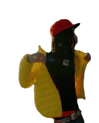 Ybn Nahmir, wearing a red cap and black shirt, opens and shows off his bright yellow puffer jacket with a cool gesture.
