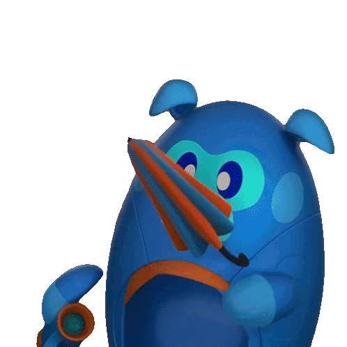 Deebo, the blue and orange cartoon character, opens his matching umbrella to avoid getting wet.