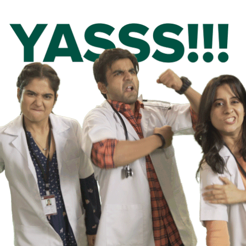 Anshul Chauhan, Ayush Mehra, and Sarah Hashmi from Operation MBBS cheer with a big 'YASSS!!!' in this energetic sticker.