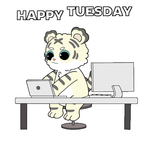 Ordinaryfrends character working on a laptop at a desk, wishing a Happy Tuesday.