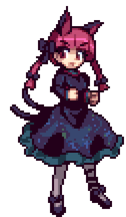Orin, the Touhou character, performs a lively pixel art dance, showcasing her cat-girl features and dark, frilly dress.