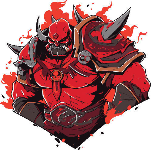 a cartoon drawing of a red monster with horns and a skull on his chest
