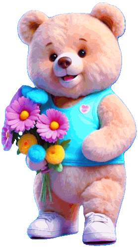 a teddy bear wearing a blue shirt is holding a bunch of flowers