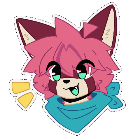 Ouka, a pink furry character with green eyes and a blue bandana, animatedly yaps.