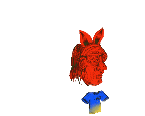 A red painted head with bunny ears, glasses, and a mullet, along with a blue shirt, animate by shrinking and growing.
