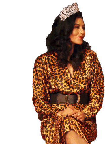 Adela Vadillo, wearing a glamorous leopard print dress and a sparkling tiara, smiles while posing elegantly.