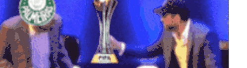 a blurred image of two men sitting in front of a trophy