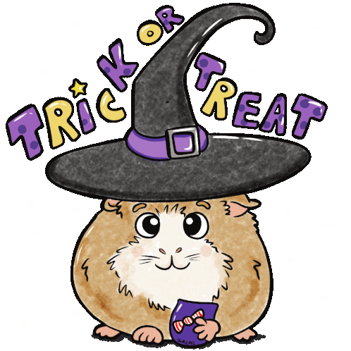 a drawing of a hamster wearing a witch hat with the words trick or treat written on it