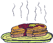 A stack of steaming pancakes topped with butter and syrup on a yellow plate, rendered in pixel art style.