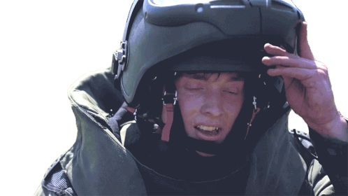 Brandon William, visibly exhausted and panting heavily, adjusts his helmet while wearing a heavy protective suit, conveying intense physical exertion.