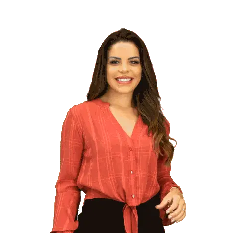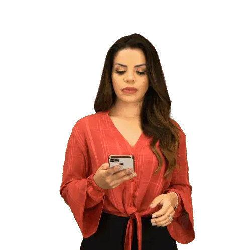 Paola Santana Pseuteamo reacts with joy and excitement, smiling and clenching her fist while looking at her phone.