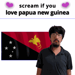 a man with glasses is standing in front of a flag that says " scream if you love papua new guinea "
