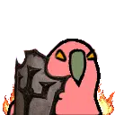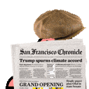 A charming character with a mustache and flat cap reads the "San Francisco Chronicle" newspaper, featuring a headline about Trump.