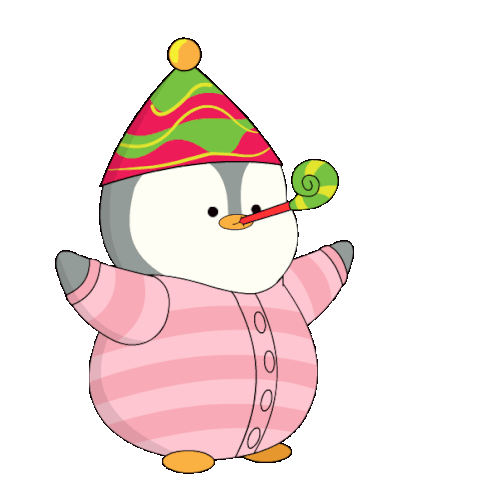 A cute cartoon penguin in a party hat and pink striped pajamas blows a party horn, celebrating joyfully.