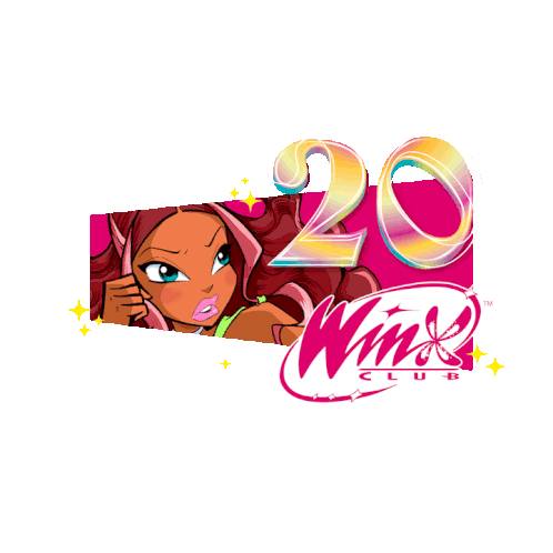 Celebrate 20 Years of Winx Club with Aisha in this vibrant anniversary sticker, featuring the iconic logo.