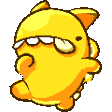A pixel art Frutti Dino character with sunglasses performs a lively party flip, ready to celebrate.