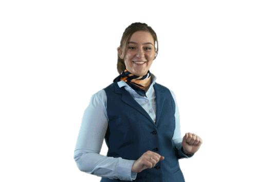 A cheerful stewardess from Eindhoven Airport happily dances and body rolls, ready for a party or safe landing.