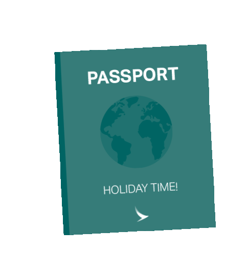 Animated teal passport with 'Holiday Time!' text and Cathay Pacific logo, perfect for travel and vacation excitement.