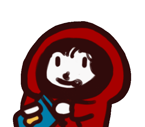 A cute, red-hooded cartoon character happily eating a bag of patatine (chips) with a big smile.