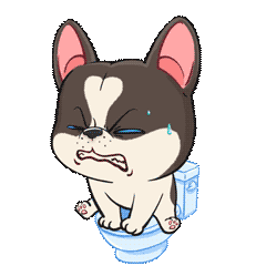 A cute Pawsum Playpawsum French Bulldog puppy struggles on the toilet, looking awkward and a bit distressed.
