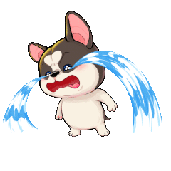 A cute Pawsum Playpawsum cartoon bulldog puppy cries profusely with large blue tears streaming from its eyes.